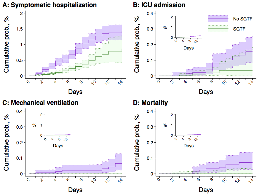 Los investigadores lo ajustaron por edad, sexo y el estado frente a las vacunas, esto último es muy importante. Hubo 21 internaciones (0.3%) y ninguna muerte entre los casos con la variante ómicron, comparados con 116 hospitalizaciones con la variante delta (2.2%) y 7 muertes (0.3%). El seguimiento fue de 25 dias.