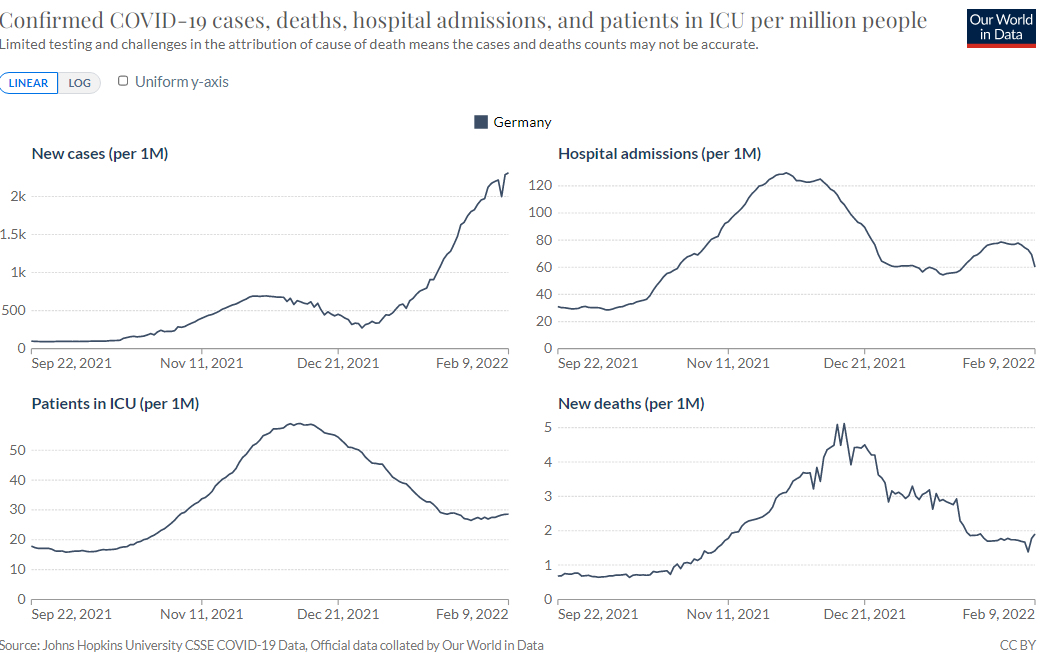 En este gráfico podemos ver la evolución de los casos, de las internaciones en UCI y las muertes en la ciudad de Buenos Aires para la segunda ola (variante gama) y la tercer ola (con variantes gama, delta y a partir del 25 de diciembre con ómicron). Se destaca, y es algo que se ve en todos los gráficos que aunque el número de casos fue de 5 o más veces mayor, la mortalidad no se acopló. En el caso de la ciudad de Buenos Aires uno espera que la mortalidad sea mayor ya que es la población más "envejecida" de Argentina, aunque también uno de los distritos más vacunados (90% con al menos dos dosis).Un gráfico muy parecido se puede observar en Londres, Alemania y también en España o este otro gráfico de España. Solo por dar más ejemplos, porque estos gráficos se están reproduciendo en cada uno de los países donde la variante ómicron está llegando.
