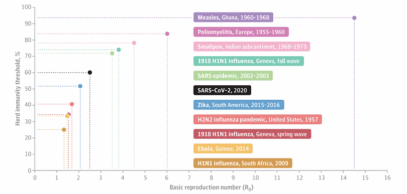 Se asume que a mayor contagiosidad (mayor R0) de un determinado gérmen, mayor será el número de población necesario para vacunar para lograr este efecto. Se estima que en para el sarampión es de un 90%, y Fauci en Estados Unidos también ha dicho que ese valor debe alcanzar la cobertura de vacunación en el caso de la actual epidemia, lo que resulta todavia muy ambicioso para ese pais. Muchos pensaron que al llegar Israel al 60% de su población vacunada y comenzaron a disminuir los casos en el pais, esta inmunidad habia sido alcanzada, lo que posteriormente fue cuestionado y descartado (9). Otros paises que ahora tienen tasas de vacunación más altas que Israel, están teniendo un número cada vez más alto de casos, pero en algunos disminuyen las internaciones y las muertes. Es seguro que el tema es más complejo que el sólo porcentaje de vacunados en un pais. Vale recordar que Israel superó el 55% de cobertura en Abril de 2021, por lo que los motivos para el crecimiento de casos posterior pueden ser múltiples, como casi todo en medicina. En Israel se pudieran haber conjugado factores tan disímiles como el desvanecimiento de la eficacia (medida por el número de anticuerpos neutralizantes), desventaja del primer jugador (first mover disavantaged), hipercontagiosidad de la variante delta, 37% de su población sin vacunar al comenzar su última ola, corto espacio interdosis (3 semanas) que da lugar a una pérdida de la memoria de células B, menor dosis mRNA (30 µg vs Moderna 100 µg), levantamiento temprano de medidas de restricción y un 17% de población no elegible para ser vacunada aún. Con la dosis de refuerzo a la población israelí ya no podremos saber lo que hubiera sucedido. De ser asi los paises que debieron aumentar el intervalo interdosis, por razones de abastecimiento, pudieran verse potencialmente e inesperadamente beneficiados, tal es el caso de Argentina.En el caso de la epidemia por SARS-CoV-2 las vacunas podrian reducir la transmisión hasta en un 30%, en un estudio realizado británico realizado entre Diciembre 2020 y Marzo 2021 entre convivientes de trabajadores de la salud y hecha a conocer por una carta al editor en el NEJM el 8 de Septiembre de 2021. Ya otros estudios (3, 4, 5, 6, 7, 8) en todo el mundo, habian mostrado también una disminución de los contagios en un amplio rango entre 10% y un 90%, pero en todos los casos, al igual que en los de esta carta fueron realizados cuando la variante delta no era la dominante. Sabemos que la carga viral con esta variante es igual en vacunados que en no vacunados (1), y ahora se ha confirmado que las vacunas no disminuyen la transmisibilidad en esta variante.[Lancet] , lo que explica que el número de casos pueda aumentar, sin necesariamente aumentar los casos graves o la mortalidad. La relevancia en la práctica es que esto refuerza el hecho de que estar vacunado reduce pero no evita el riesgo de contagiar, lo que puede ser relevante, en momentos de gran circulación comunitaria por lo que pudiera seguir siendo necesario instaurar periodicamente medidas no farmacológicas. No sabemos aún cual será el desenlace, pero en principio esto debiera alertar para no dar una falsa sensación de seguridad a los vacunados y abandonar totalmente las medidas no farmacológicas que aún mantienen gran efectividad en términos de disminuir la morbimortalidad.